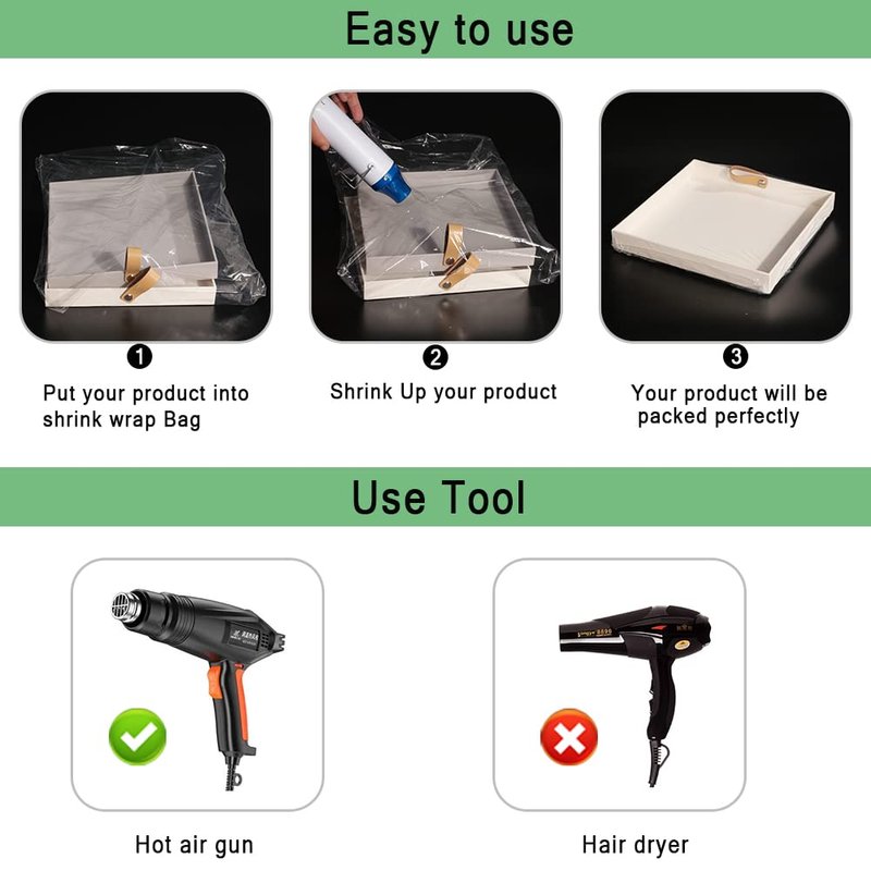 - Easy to Use: Just put the things in the shrink bags and then use a heat gun, heat tunnel to shrink and seal bags evenly until it is surrounded completel. Don't use a hair dryer because it doesn't have enough heat.
