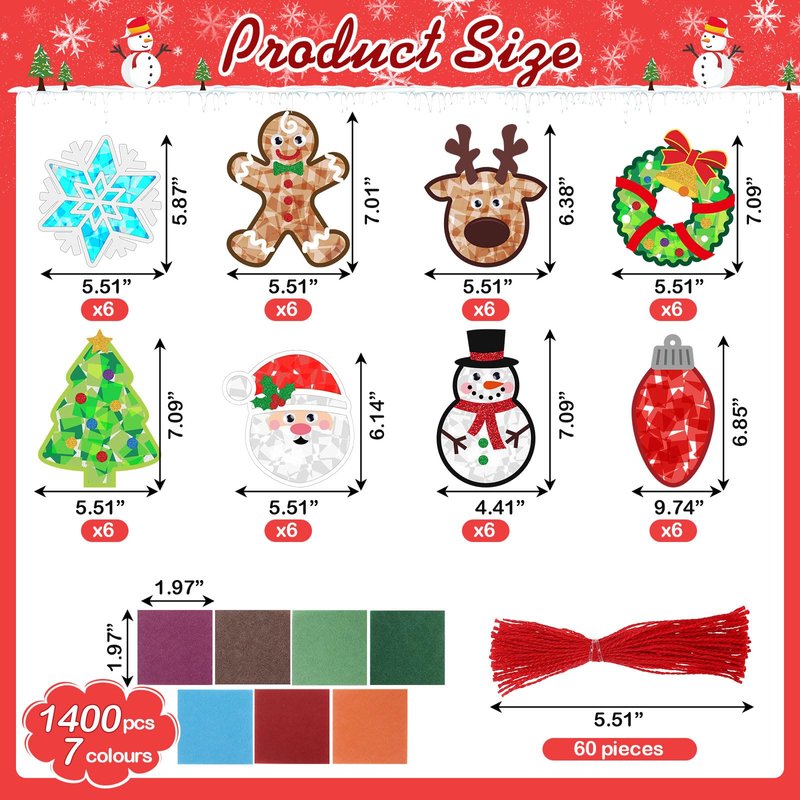 - Rich Styles and Quantity: our Christmas sun catcher kit will provide diverse project opportunities, which includes 48 pieces of Christmas DIY crafts cutouts (8 styles in total), 1400 pieces of colored tissue paper in 7 colors, 60 pieces of red ribbons of about 25 cm, 1 piece of safety scissor and 1 piece of glue stick, large in quantity and complete in combination to meet your needs to create personal projects for various activities