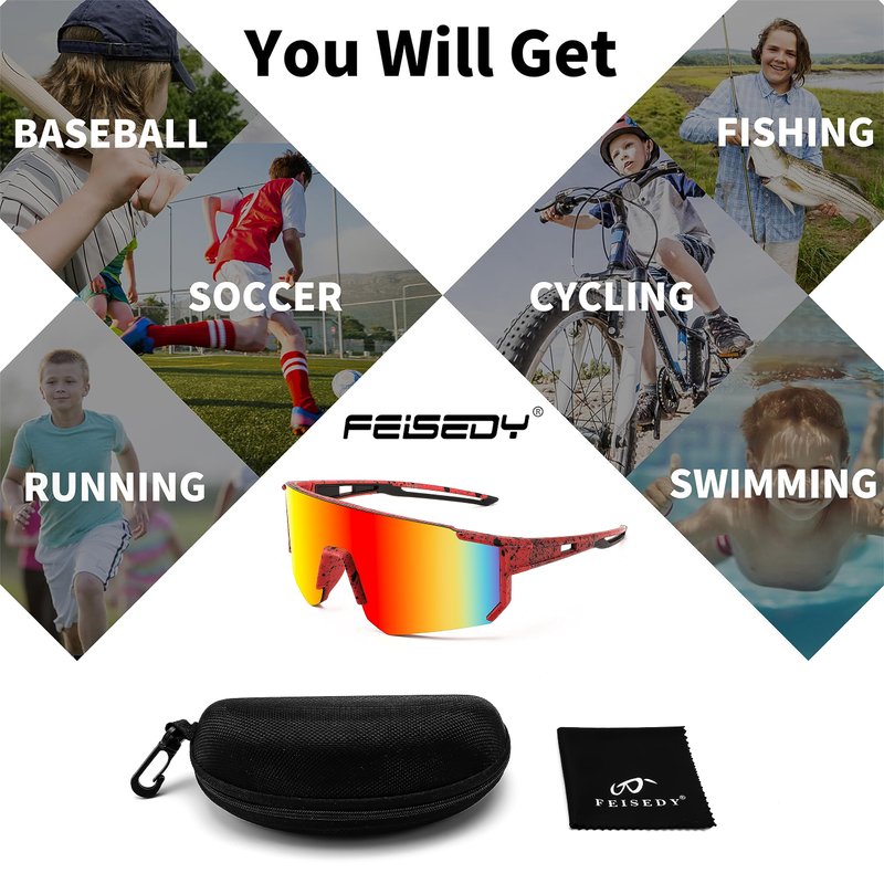 - [Multipurpose Sports Glasses] FEISEDY great fashion design sport sunglasses making the ideal for outdoor sports, protect children's eyes when skiing, cycling, climbing, biking, running, fishing, softball, baseball and so on.