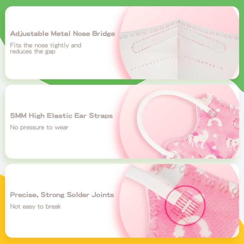 - - Comfortable & Breathable - The 5MM widened ear loops are more comfortable to wear, the adjustable nose bridge strips tightly fit the nose, making the kn95 kids face mask not easy to fall off