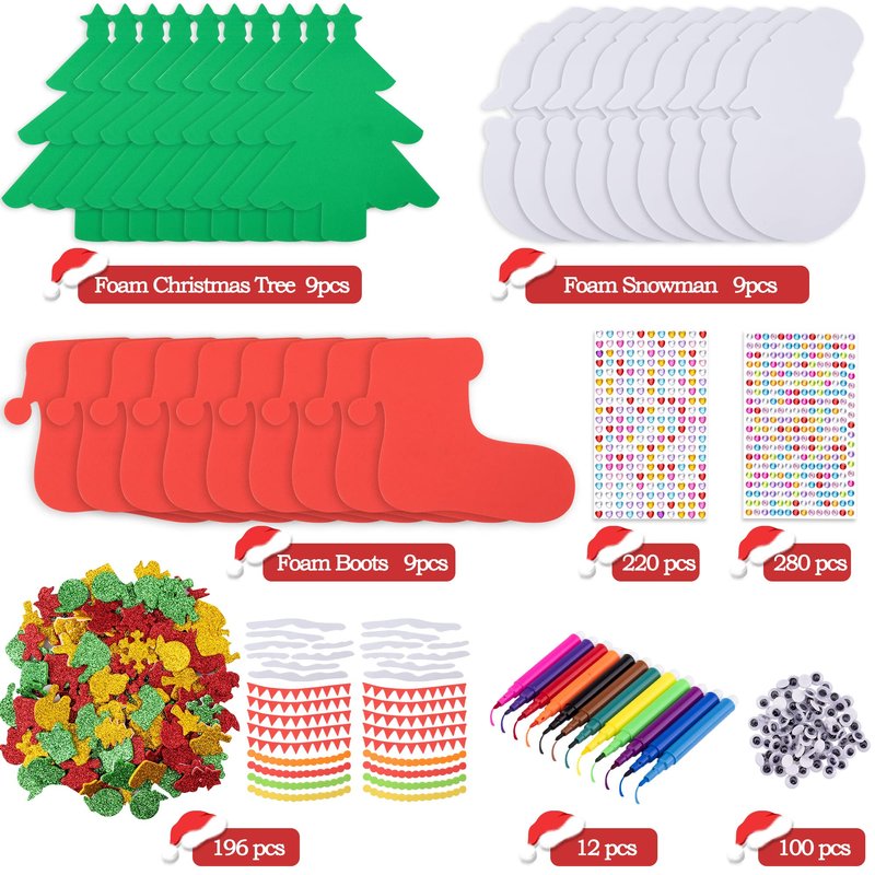 - Package include: 9 pcs snowman foam stickers, 9 pcs boots sticker and 9 pcs Christmas tree foam sticker for craft, 196 pcs small Christmas theme glitter foam stickers, 100 pcs wiggle googly eyes, 2 sheets rhinstones (500 pcs) and 12 pcs different colors watercolor pens, totally 835 pcs