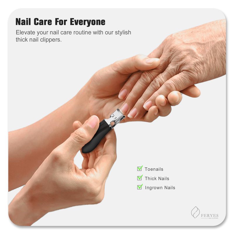 "Powerful and Gentle Nail Care for All Don't let thick nails stand in the way of your perfect nail care routine. FERYES 0.2inch Wide Open Jaw Nail Clippers for Thick Nails are here to provide you with the best of both worlds - powerful trims without compromising on gentleness. Unleash the Potential: No more compromising on nail care! Our versatile nail clippers set allows you to trim fingernails, toenails, thick nails, ingrown nails, and even remove dead skin. A Clean and Comfortable Experience: Say goodbye to messy nail clippings scattered around! Our smart catcher design ensures that nail clippings stay contained, keeping your nail care routine tidy and stress-free. The rubber covering provides a comfortable grip, and the ultra-sharp blades cut through thick nails smoothly. A Gift Worth Giving: Elevate your nail care routine with our stylish thick nail clippers. Not just functional, they also add a touch of elegance to your grooming kit. Sturdy packaging ensures a safe arrival, making our nail clippers an ideal small gift for your loved ones or a practical addition to your nail care essentials. Don't settle for average nail clippers. Embrace the efficiency, durability, and elegance of FERYES Thick Toenail Clipper. Say hello to perfectly groomed nails and a more enjoyable nail care experience. Order yours today and discover the joy of effortless nail care."