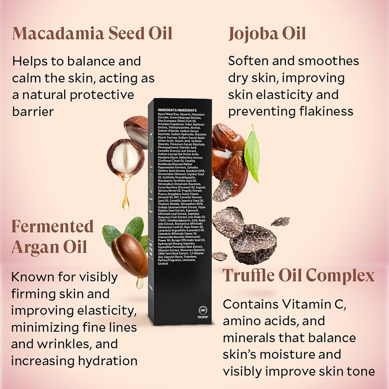- Premium Blend of Fermented Oils and Glycerin: Our cleanser is enriched with a Truffle Oil Complex, Fermented Green Tea Oil, Fermented Sunflower Seed Oil, and Fermented Argan Oil. This potent mix offers an array of benefits from vitamin C, amino acids, antioxidants, and minerals; enhancing your skin's natural radiance.