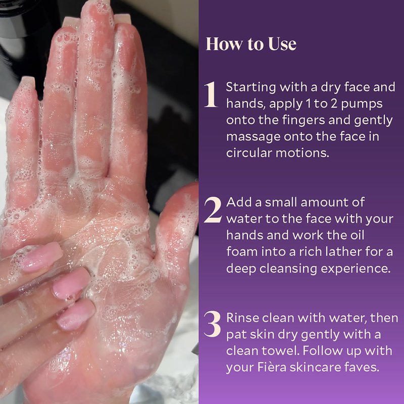- Revolutionary Oil-to-Foam Cleanser: Experience a luxurious cleansing ritual with Fièra's unique Oil to Foam Cleanser. Our innovative formula combines the deep cleansing power of oil with the refreshing experience of foam. Ideal for simplifying your skincare routine without compromising on quality. It effortlessly removes makeup, dirt, and impurities, leaving your skin feeling refreshed and clean.