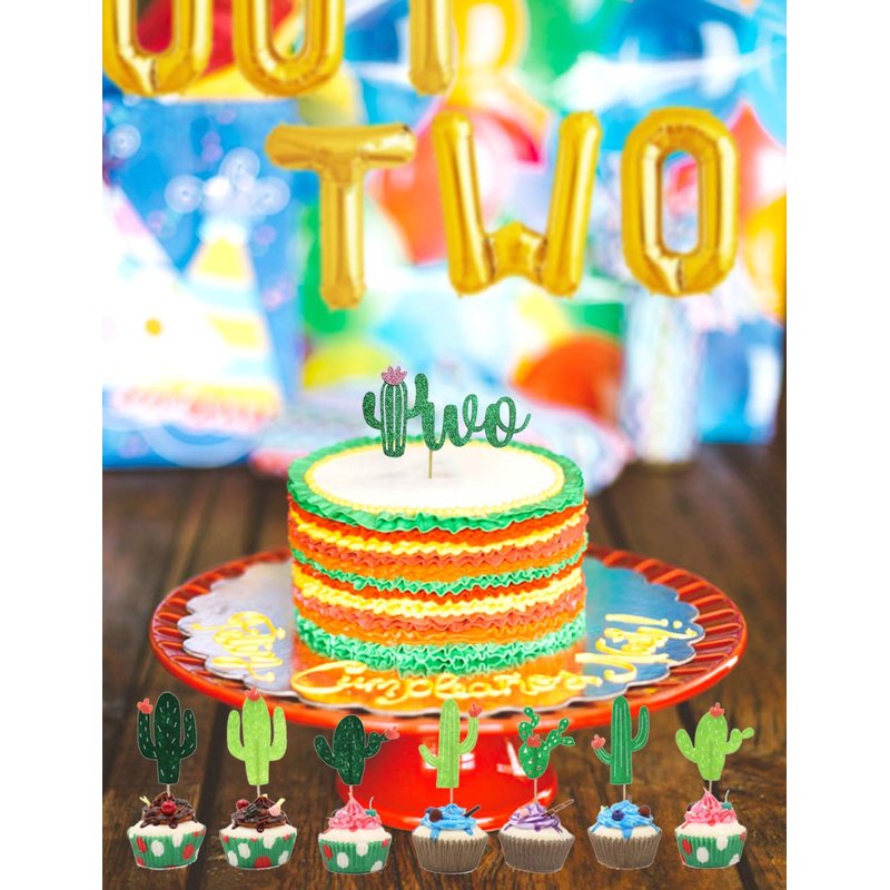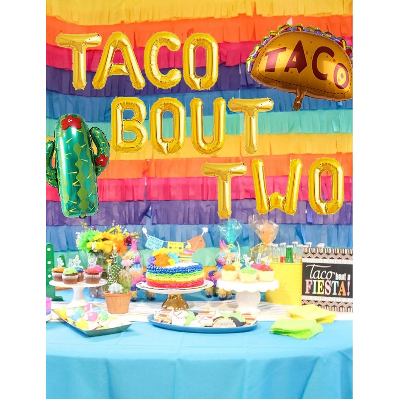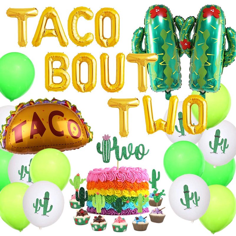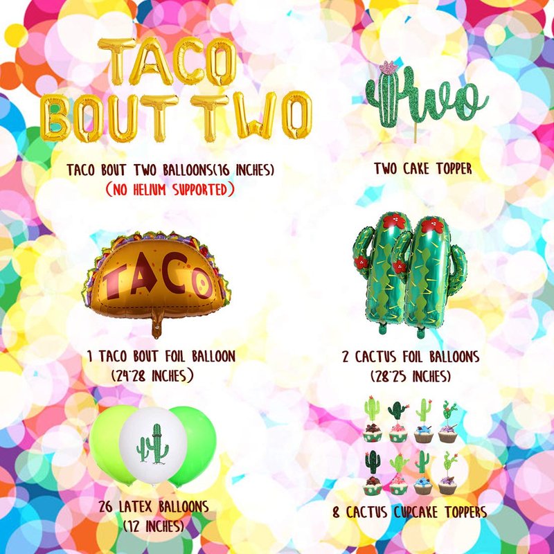 - Package Includes: 1 set of TACO BOUT TWO balloons(16 inches), 2 Cactus foil balloons(28*25 inches), 1 taco bout foil balloon(24*28 inches), 1 TWO cake topper, 8 cactus cupcake toppers, 26 latex balloons(12 inches).