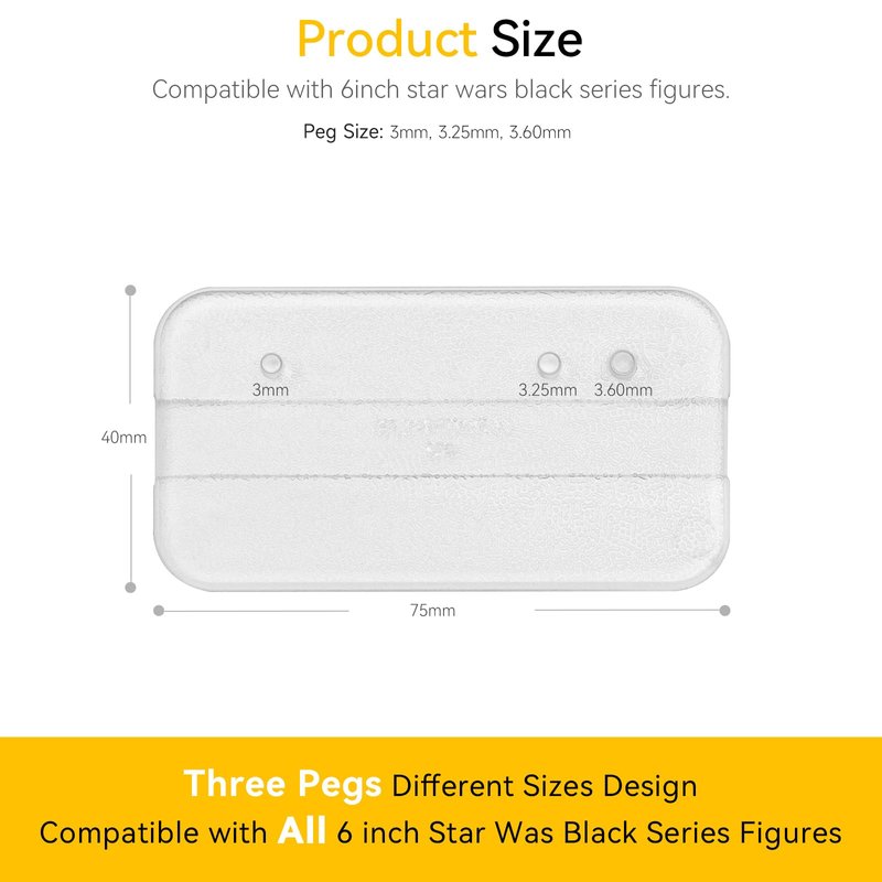 - ATTENTION TO THE SIZE - Each black series figuras display stand measures approx. 75mm/ 3inch length x wide 40mm/ 1.6inch(not 3d printed) for a high quality finish. 3.0mm/ 0.12inch - 3.6mm/ 0.14inch peg hole in bottom of foot diameter and 3.5mm/ 0.13inch in thickness. Compatible with 6 inch Star Was Black Series action models.