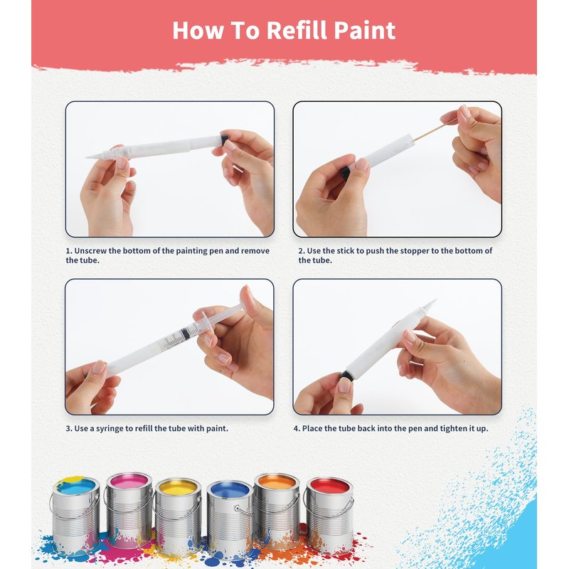 Introducing our fillable paint pens for touch up, designed to be your reliable companion for home paint repair, ensuring that your living space always looks fresh and vibrant. Whether it's scuffs, scratches, or marks on walls, decorations, ceilings, or doors, our refillable paint pens for walls, touch up work effortlessly handles them all, reviving the beauty of your home. Versatility is one of the key selling points of our paint touch up pen. Say goodbye to cumbersome paint tools and messy paint cans, as our touch up paint pens for walls caters to all your repair needs in one convenient tool. It easily fills any latex paint and fixes any flaws on the surface, giving your home a new lease of life. Our fillable paint pen features the latest 2023 design, equipped with a button for precise paint control. Adjust the paint output according to your needs, ensuring accurate application. This means you can confidently tackle various home paint projects without worrying about paint drips or splatters. Using our touch up paint pens is incredibly simple. Just a gentle press releases a smooth and even flow of paint onto the surface in need of repair. Even beginners can effortlessly complete repair work, minimizing errors and wastage. Moreover, our touchup paint syringe pen is reusable, allowing you to refill it with paint without any hassle, ensuring long-term usage and providing a durable repair solution for your home. In addition to convenience and efficiency, we prioritize quality and safety. Our refillable paint brush pen is crafted using premium materials, ensuring durability and stability. It also meets relevant safety standards, being non-toxic and safe to use. Let our empty paint pens refillable become your trusted companion for home maintenance, bringing convenience, efficiency, and remarkable repair results to your living space. Say goodbye to scratches and flaws, and let your home shine with renewed brilliance!