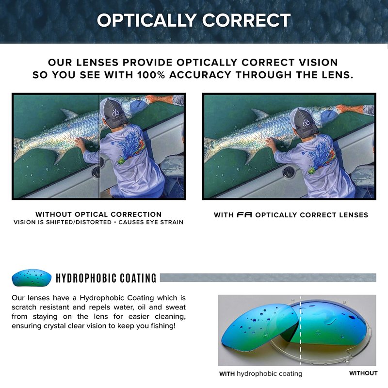 - OPTICALLY CORRECT: Our lenses provide optically correct vision, ensuring 100% clear views. Normally, light is distorted when it goes through lenses. We fixed this by adjusting the lens thickness, so now you’ll have no issue spotting fish clearly.