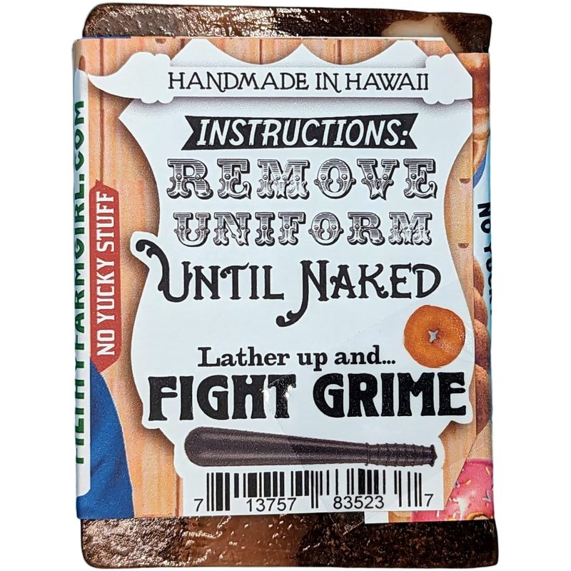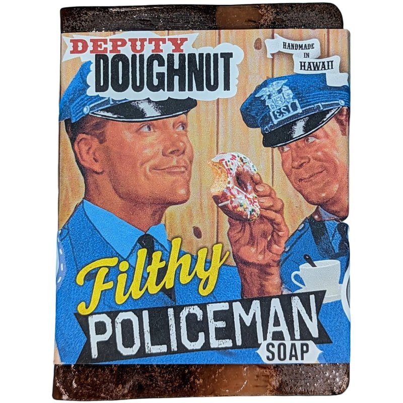 Filthy Farmgirl Deputy Doghnut Filthy Policeman all natural large vanilla spice soap bar by Filthy Farmgirl. Each handmade soap bar is cut to over 5 ounces. Each bar soap measures approximately 3.5 x 2.5 x 1 inch. Special ingredients include Ginger Essential Oil, Cinnamon Leaf Essential Oil, Clove Essential Oil, Cinnamon, Vanilla, Almond, Ginger Powder, Cocoa Butter. Filthy Farmgirl vegan friendly glycerin soap bars are 100% natural and suitable for the entire body. Being good to the earth starts with being good to each other! Healthy, happy (and yes, clean!) people are intrinsically good for the planet. Our natural soaps put people in touch with the real world through their senses, and enlivens the otherwise mundane ritual of bathing. We have been cooking soaps for ourselves for many years, and now we are happily putting quality bath products into the hands of like minded farmgirls and farmboys like you. Our soap recipes are all 100% natural. Coconut Oil is the main ingredient, Saponified Vegetable Oils (Coconut, Palm, Castor and Safflower), Kosher Veggie Glycerin, highest quality essential oils herbs and spices (Organic when available), Sorbitol (natural thickener), Purified Water Sorbitan oleate (natural emulsifier), Sodium hydroxide (natural saponifier). Absolutely no detergents, surfactants, sulfates, artificial scents, colorizers, or petroleum products of any kind. Our Labels are printed on 100% recycled paper. We work hard to make sure every single bar of our soap is made with love and care, and our company is eco-friendly. Soap is not just about getting clean, it’s about loving your body and the earth. All natural large glycerin bar soap with essential oils by Filthy Farmgirl.