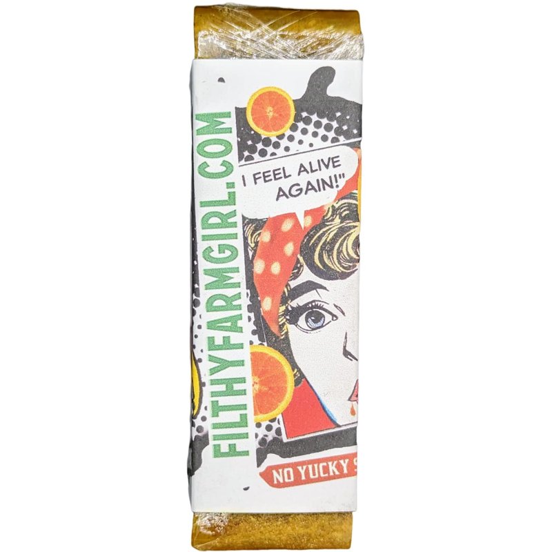 Filthy Farmgirl Filthy Vampire all natural large orange tumeric soap bar by Filthy Farmgirl. Each handmade soap bar is cut to over 5 ounces. Each bar soap measures approximately 3.5 x 2.5 x 1 inch. Special ingredients include Blood Orange Essential Oil, Pomegranate Molasses, Orange Essential Oil, Beet Powder, Turmeric Powder, Shea Butter, Organic Coconut Oil. Filthy Farmgirl vegan friendly glycerin soap bars are 100% natural and suitable for the entire body. Being good to the earth starts with being good to each other! Healthy, happy (and yes, clean!) people are intrinsically good for the planet. Our natural soaps put people in touch with the real world through their senses, and enlivens the otherwise mundane ritual of bathing. We have been cooking soaps for ourselves for many years, and now we are happily putting quality bath products into the hands of like minded farmgirls and farmboys like you. Our soap recipes are all 100% natural. Coconut Oil is the main ingredient, Saponified Vegetable Oils (Coconut, Palm, Castor and Safflower), Kosher Veggie Glycerin, highest quality essential oils herbs and spices (Organic when available), Sorbitol (natural thickener), Purified Water Sorbitan oleate (natural emulsifier), Sodium hydroxide (natural saponifier). Absolutely no detergents, surfactants, sulfates, artificial scents, colorizers, or petroleum products of any kind. Our Labels are printed on 100% recycled paper. We work hard to make sure every single bar of our soap is made with love and care, and our company is eco-friendly. Soap is not just about getting clean, it’s about loving your body and the earth. All natural large glycerin bar soap with essential oils by Filthy Farmgirl.