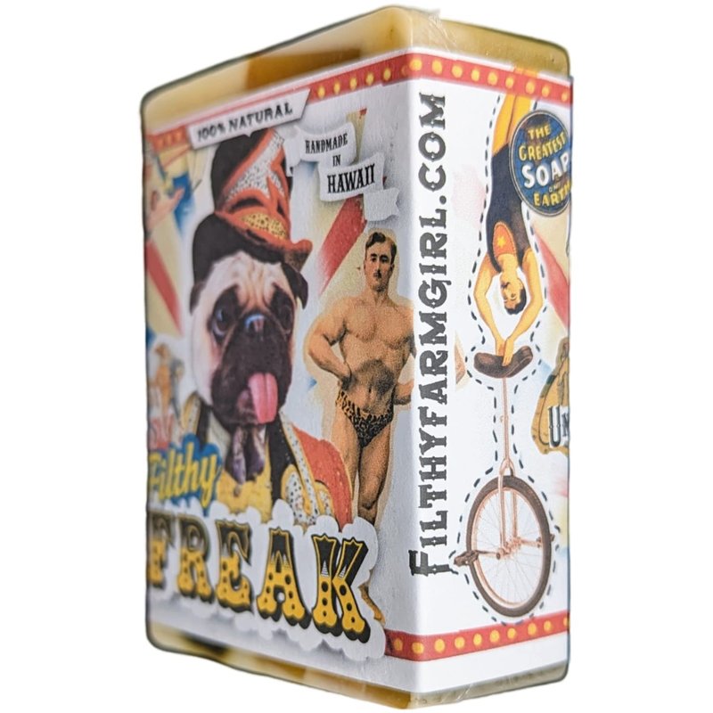 Filthy Farmgirl Filthy Freak all natural large Clove Mint soap bar by Filthy Farmgirl. Each handmade soap bar is cut to over 5 ounces. Each bar soap measures approximately 3.5 x 2.5 x 1 inch. Special ingredients include Blood Orange Essential Oil, Spearmint Essential Oil, Clove Essential Oil, Cinnamon Essential Oil. Filthy Farmgirl vegan friendly glycerin soap bars are 100% natural, Being good to the earth starts with being good to each other! Healthy, happy (and yes, clean!) people are intrinsically good for the planet. Our natural soaps put people in touch with the real world through their senses, and enlivens the otherwise mundane ritual of bathing. We have been cooking soaps for ourselves for many years, and now we are happily putting quality bath products into the hands of like minded farmgirls and farmboys like you. Our soap recipes are all 100% natural. Coconut Oil is the main ingredient, Saponified Vegetable Oils (Coconut, Palm, Castor and Safflower), Kosher Veggie Glycerin, highest quality essential oils herbs and spices (Organic when available), Sorbitol (natural thickener), Purified Water Sorbitan oleate (natural emulsifier), Sodium hydroxide (natural saponifier). Absolutely no detergents, surfactants, sulfates, artificial scents, colorizers, or petroleum products of any kind. Our Labels are printed on 100% recycled paper. We work hard to make sure every single bar of our soap is made with love and care, and our company is eco-friendly. Soap is not just about getting clean, it’s about loving your body and the earth. All natural large glycerin bar soap with essential oils by Filthy Farmgirl.