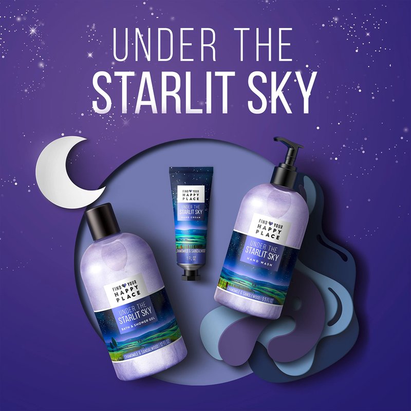 Make a wish with this liquid gel hand wash. Scented with soothing chamomile and musky sandalwood with notes of fresh rosemary and tonka bean, the liquid hand soap washes away dirt and germs to leave hands feeling clean and refreshed. This nourishing formula is sulfate and paraben-free, with a 3X blend of shea butter, cocoa butter and vitamin E. To use, simply lather on to your skin for 20 seconds and then rinse away dirt, germs and bacteria. This liquid hand soap is paired best with the complete Under The Starlit Sky collection for an immersive sensory experience. Find Your Happy Place is a NEW brand of sensorial bath and body products that helps everyone reclaim bath time, so they can find a little peace amidst everyday stress. Find Your Happy Place reminds us of places that feel the most connected. They're places where we find strength, peace and things that make us feel good. We asked people around the country, "How do you get to your happy place?" Inspired by their stories, we created bath and body collections to transport your senses to places that made others feel special. Post your story with Share your happy place and help inspire the next collection.