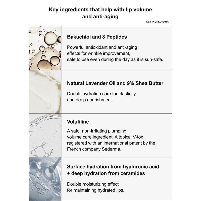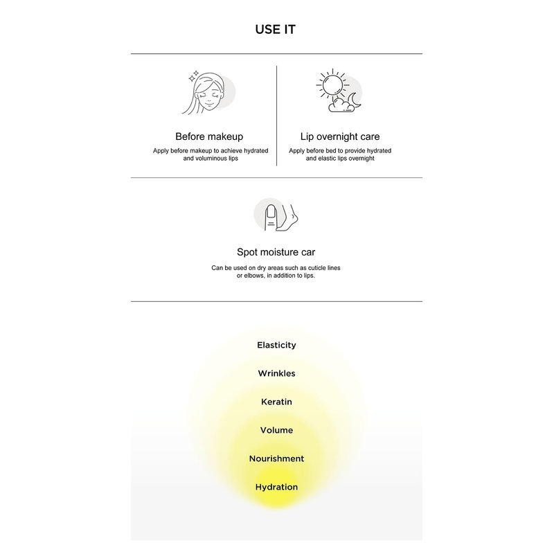 - How to Use: Before makeup: Apply before makeup to achieve hydrated and voluminous lips. Overnight care: Apply before bed to provide hydrated and elastic lips overnight. Spot moisture care: Can be used on dry areas such as cuticle lines or elbows, in addition to lips.