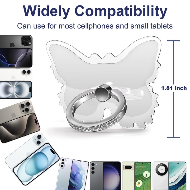 Finger Ring Stands Set Cellphone Ring Holder Transparent Phone Holder 360° Rotation Ring Stand Clear Cell Phone Kickstand Compatible with most of Phones, Tablets, 2 Pack of Butterfly Silver