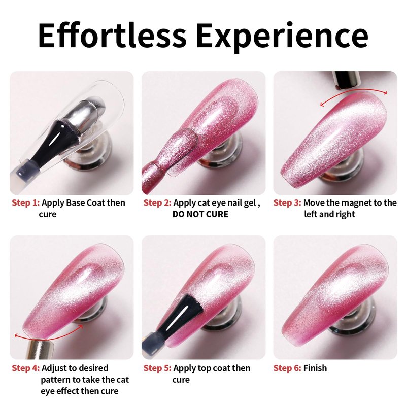 - Gorgeous Effect - Galaxy Deep Purple Cat eye gel nail polish can work with different color base to get different effect. We suggest that you use a dark base coating, and our page shows the color effect of applying cat's eye gel to the black base coating. Use the magnet stick over the nail surface about 3-5mm for 5-10 secs to create desired pattern before curing, easily to build out Galaxy cat eye holographic gorgeous effect.