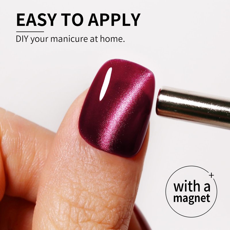 - Gorgeous Effect - Ruby Red Cat eye gel nail polish can work with different color base to get different effect. Use the magnet stick over the nail surface about 3-5mm for 5-10 secs to create desired pattern before curing, easily to build out cat eye holographic gorgeous effect.