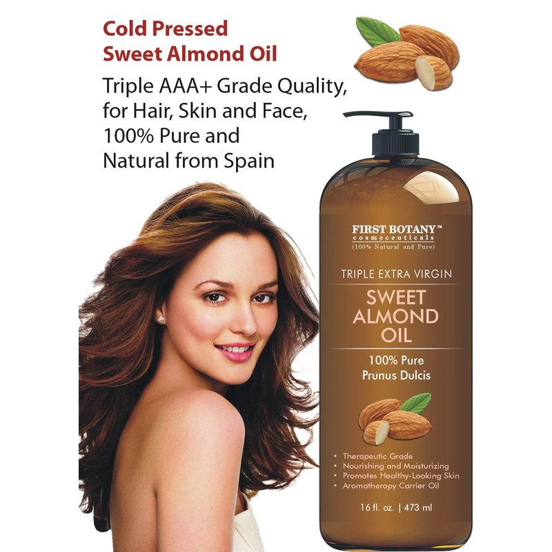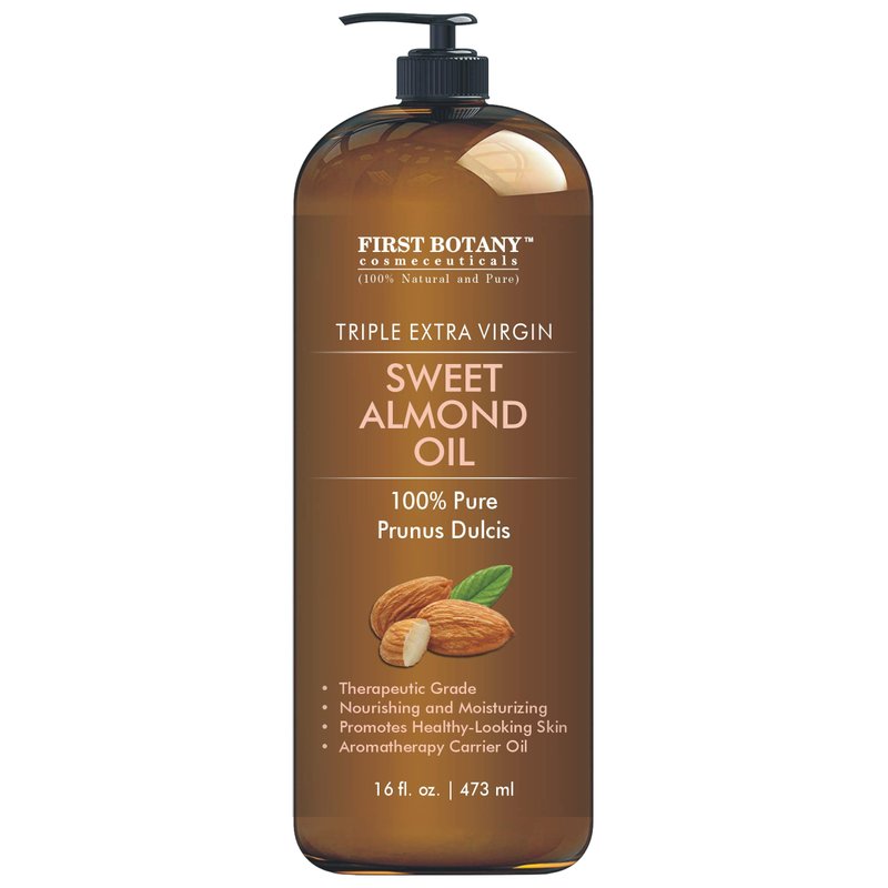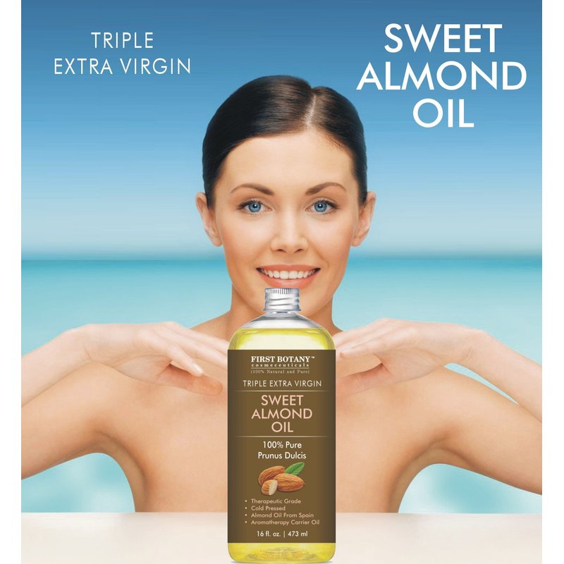 - Multifold Uses - Sweet almond oil nourishes skin and hair and can be added to your daily beauty routine morning or nighttime. Prepare your own facial serum or hair mask by adding a few drops of First Botany’ essential oils. Our Almond oil can be used as a Natural Makeup Remover . Everyday makeup removers contain synthetic ingredients that can irritate the skin. As an all-natural makeup remover, our almond oil is suitable for stubborn eye makeup, foundation and more!