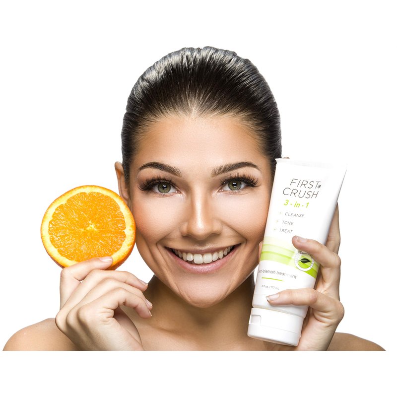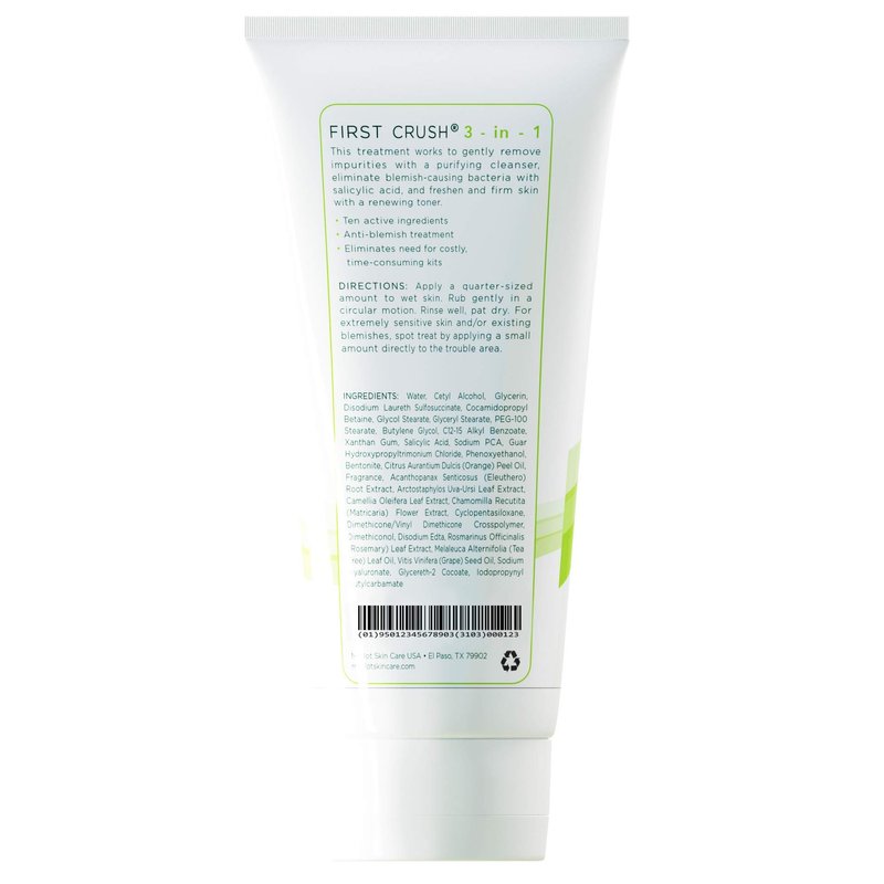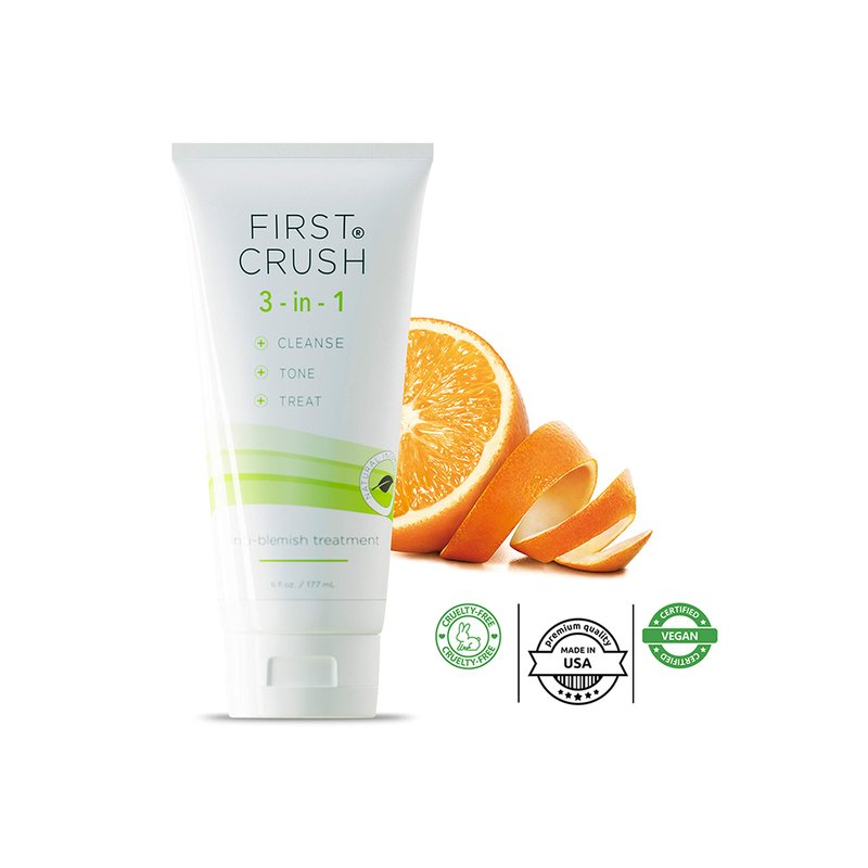 First Crush 3-in-1 Blemish or Rosacea Treatment for All Skin Types All-Natural for Oily, Sensitive, and Dry Skin Proprietary all natural formula that includes soothing ginseng extract, tea tree oil, green tea, rosemary, orange peel extract, and grape seed extract. We do NOT include any harsh benzoyl peroxide or other chemicals that contribute to acne breakouts. Using salicylic acid, First Crush freshens and firms the skin with a renewing toner. Non-foaming cream cleanser.