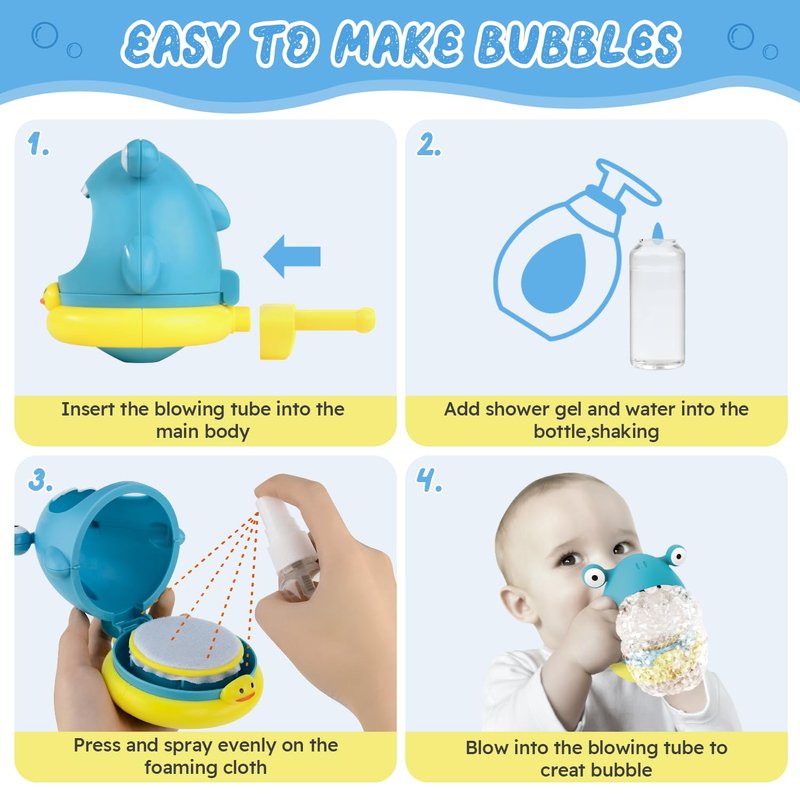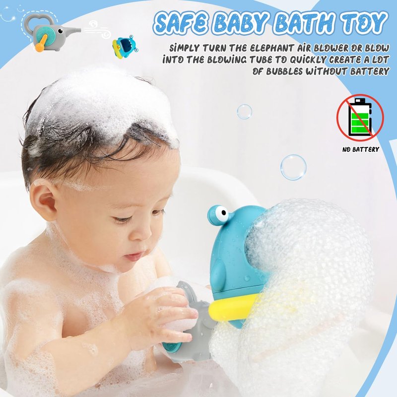 - BATTERY-FREE FUN: Say goodbye to battery worries! Baby bath toys only need to use the handle and straw to operate, no batteries needed, no need to worry about battery leakage when playing in the water, so that the baby can play safely and have fun. Simply hand it to your little one and enjoy the bubble fun