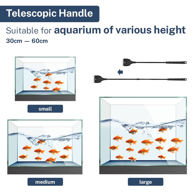 - 【Adjustable Length】Aquarium glass cleaner tool is designed with two extension rods, maxi length can be extended up to 53cm/21inches, which ensure that the scraper cleans the depths of the fish tank, suitable for 30-60cm/11.8-23.6" high fish tanks.