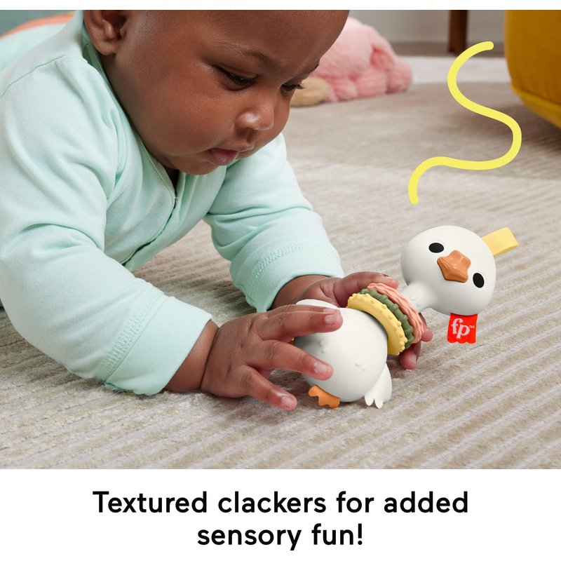 - Goose-themed baby clacker toy with easy-to-grasp body and textured rings for sensory play