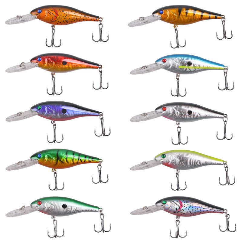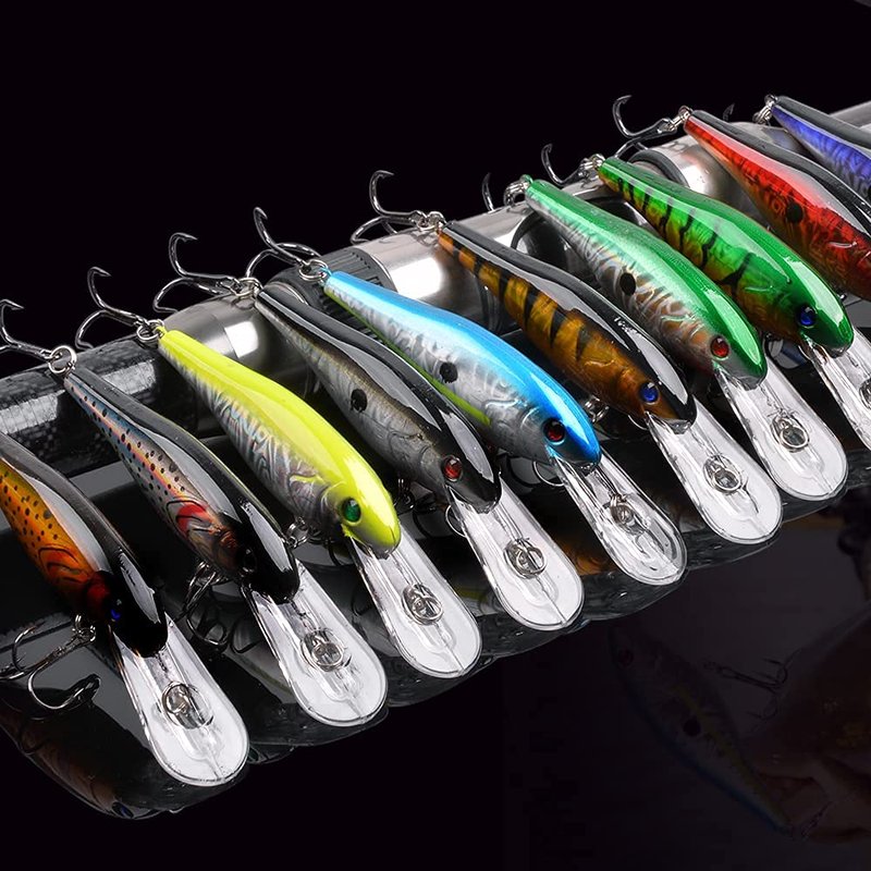 - 【PACKAGE INCLUDED】10pcs mixed color lures(Random Shipped); Weight: 0.36oz; Length: 4.5inch, Hook Size: 4# 0.75inch*0.35inch; Lifelike 3D eyes, vivid fish scale pattern on the surface and 2 strong and sharp high carbon steel treble hooks