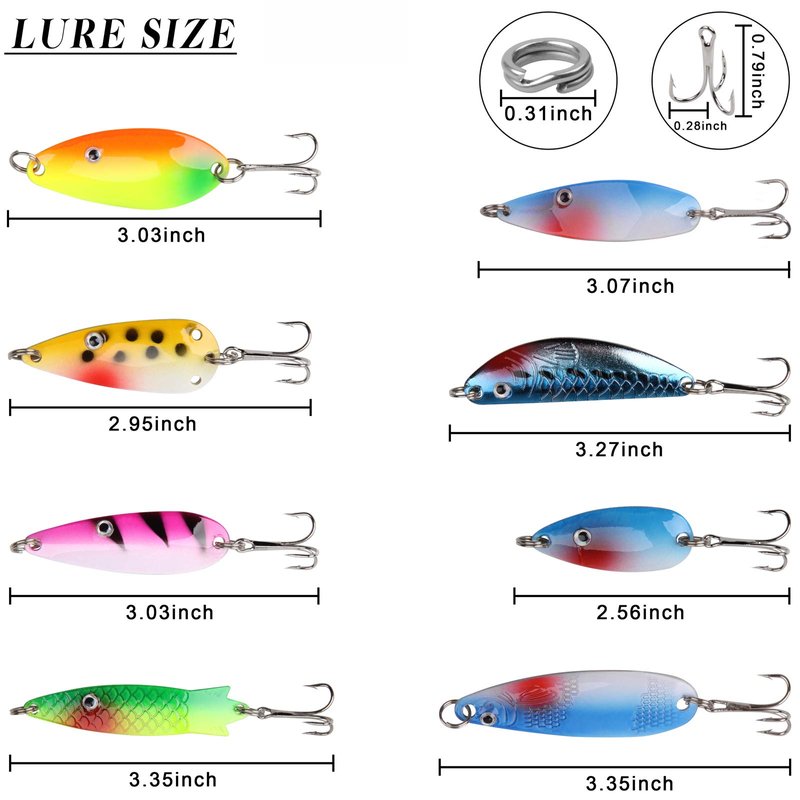 - Metal spoon lures in different colors and sizes, ideal for both freshwater and saltwater fishing Trout, Bass, Perch,Salmon, Pike, Bluegill,Walleye etc.
