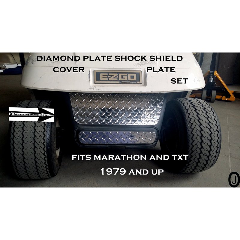 EZGO SHOCK SHIELD SET FITS 1979 to 2013 MARATHON AND TXT CARTS TO INSTALL: TAKE OFF YOUR BLACK PLASTIC COVER AND CLEAN. THEN LINE UP BOLT HOLES OF DIAMOND PLATE WITH HOLES IN YOUR PLASTIC COVER THEN INSTALL RIVETS or SCReWS. ON THE LOWER PIECE LINE IT UP AND DRILL AND INSTALL RIVETS, REINSTALL YOUR BOLTS AND YOUR DONE. Please note : This ad is for the 2 pieces of diamond plate not the plastic cover. WILL NOT FIT THE RXV CART