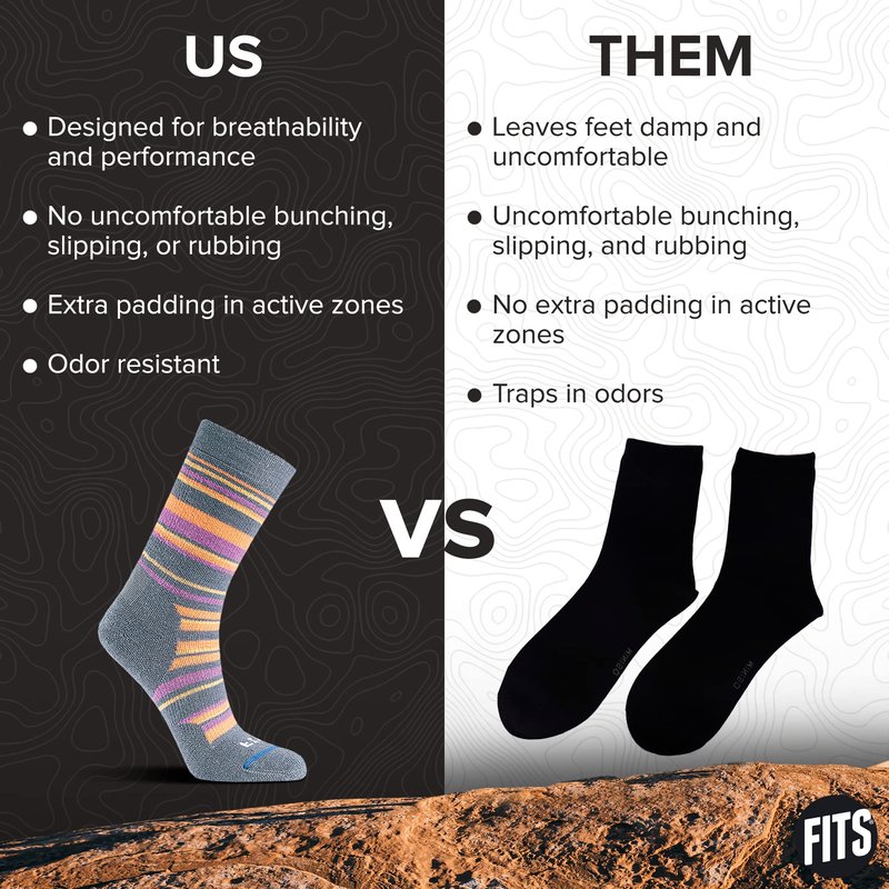 Meet the FITS Medium Hiker crew socks, "the sock that started it all." These hiking socks are a favorite amongst the adventurous for their blend of performance and comfort. Introduced more than five years ago, they have been part of the best hikers' essential equipment ever since. The merino wool used in our hiker socks, noted for its superior moisture-wicking capabilities, ensures your feet stay dry and comfortable throughout your journey, regardless of the intensity of your activities. Plus, the wool's natural breathability aids in maintaining an optimal temperature for your feet, ensuring freshness during your treks. The crew socks also have strategic cushioning in the active zones - toe, heel, and arch. This design offers superior comfort and extra protection during long hikes or strenuous outdoor activities. With the odor-resistant properties of our hiker socks, you can enjoy your outdoor adventures with the assurance of fresh feet, even after a long day of activities. Durable, comfortable, and practical, the FITS Medium Hiker crew socks are more than just a piece of clothing - they are an essential companion for outdoor adventures. They make a fantastic gift idea for the hiking enthusiasts in your life, promising comfort, protection, and freshness on all their treks. Choose the Medium Hiker crew socks and step into your next adventure with confidence.