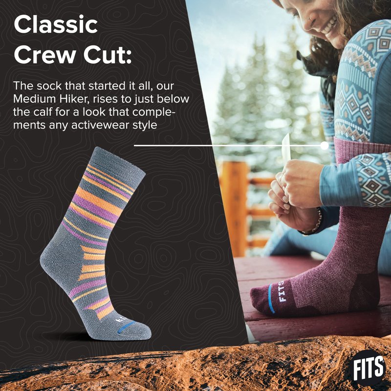Meet the FITS Medium Hiker crew socks, "the sock that started it all." These hiking socks are a favorite amongst the adventurous for their blend of performance and comfort. Introduced more than five years ago, they have been part of the best hikers' essential equipment ever since. The merino wool used in our hiker socks, noted for its superior moisture-wicking capabilities, ensures your feet stay dry and comfortable throughout your journey, regardless of the intensity of your activities. Plus, the wool's natural breathability aids in maintaining an optimal temperature for your feet, ensuring freshness during your treks. The crew socks also have strategic cushioning in the active zones - toe, heel, and arch. This design offers superior comfort and extra protection during long hikes or strenuous outdoor activities. With the odor-resistant properties of our hiker socks, you can enjoy your outdoor adventures with the assurance of fresh feet, even after a long day of activities. Durable, comfortable, and practical, the FITS Medium Hiker crew socks are more than just a piece of clothing - they are an essential companion for outdoor adventures. They make a fantastic gift idea for the hiking enthusiasts in your life, promising comfort, protection, and freshness on all their treks. Choose the Medium Hiker crew socks and step into your next adventure with confidence.