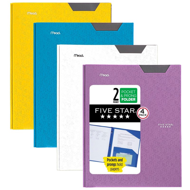 Five Star 2 Pocket Folders, 4 Pack, Plastic Folders with Stay-Put Tabs and Prong Fasteners, Holds 8-1/2” x 11" Paper, Writable Label, Tidewater Blue, White, Amethyst Purple, Harvest Yellow (38064)