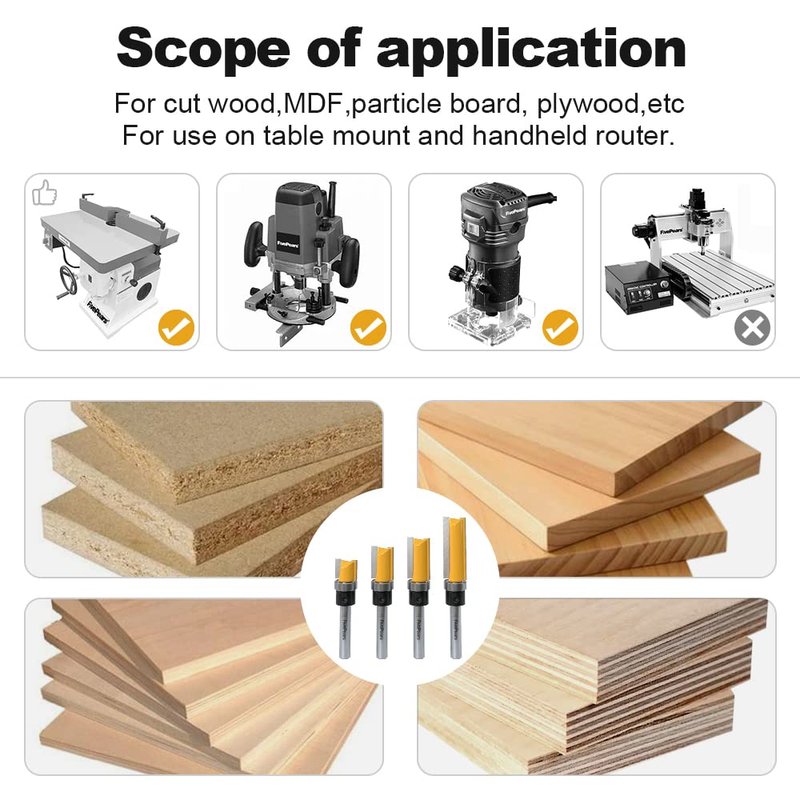- 3.[Widely used] - This flush trim router bit is suitable for wood, MDF, particleboard, plywood, compact panels, acrylic. Do not cut metal and non-wood materials such as: steel, iron, sand, etc.