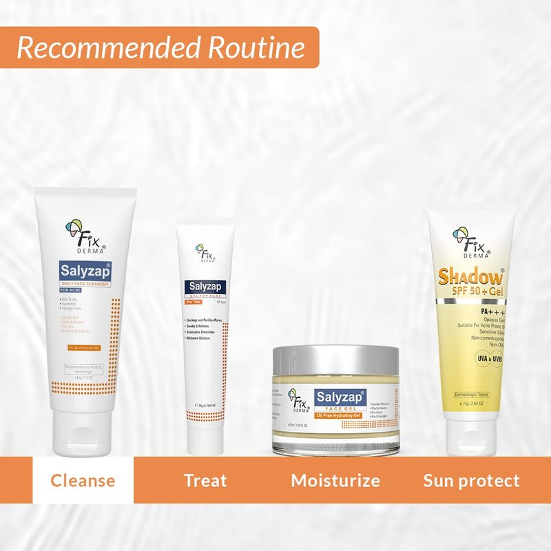 Fixderma Salyzap Cleanser helps prevent breakouts, blackheads. This unique formula eliminates oil and dirt, and cleanses without over-drying. ATTRIBUTES Unclogs & Purifies Pores Minimizes scar formation Absorbs excess oil from the skin.