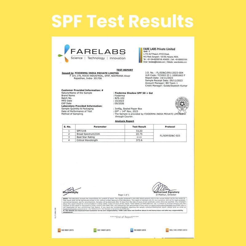 Fixderma Shadow SPF 50+ Gel is a light-weight sunscreen specially designed for the acne prone and sensitive skin. The opaque gel has been formulated with the most sun protectors which is ideal for all weathers and suits all skin types. This oil-free formulation provides an excellent UV rays coverage for a longer duration of time. Sunscreen is a least preferred skin care formulation in acne conditions because it is thought to make the skin oilier and can worse the acne. But Shadow SPF 50+ Gel is a light-weight, oil-free formulation provides a broad-spectrum protection from harmful UVA/UVB rays. Shadow SPF 50+ Gel is a well-designed formulation to give a high sun protection with a perfect skin feel. It is infused with the power of both physical blockers and chemical absorbers to give a long-lasting effect. Every skin type requires a sun protection. Sensitive skin is more prone to sun damage, which makes the sunscreen an essential need for such skin types. But most of the time using a sunscreen is avoided because a bad formulation can worse the condition. Fixderma has scientifically designed a gel-based sunscreen specially for the care of acne prone and sensitive skin. Shadow SPF 50+ Gel sunscreen is infused with the power of both physical blockers and chemical absorbers offers a safe and long-lasting protection from the UVA & UVB rays. The formulation is completely non-comedogenic and non-greasy which does not block the skin pores and makes it an excellent option for acne prone skin. It has highly sunscreen agent, antioxidant, anti-ageing, and protective agent. The combination of ethylhexyl methoxycinnamate, benzophenone-3 and butyl methoxydibenzoylmethane provides perfect full-spectrum protection. The ingredients being in dispersion phase makes the formulation safe and long performing & ingredient that is water-soluble, highly effective UVB absorber which forms water-soluble salts with the addition of a base.