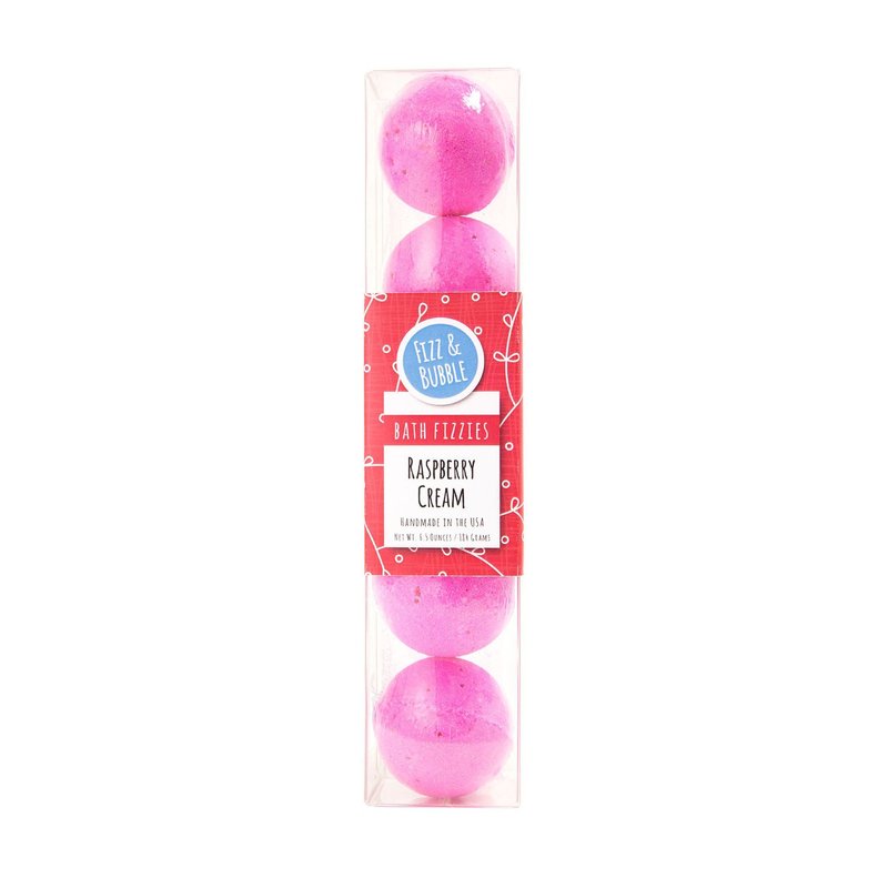 Soothe and soften your skin with our Raspberry Cream Mini Bath Fizzies! These beautiful Fizzies are fun to hold in the palm of your hand before allowing them to dissolve and envelop your skin and senses in a cloud of raspberries and sweet cream! 6.5 Ounce five pack. Benefits: All "fizzy" products feature Fizz & Bubble's signature ultra-moisturizing 8-Oil Blend that includes a carefully crafted fusion of Aloe Vera, Coconut, Grapeseed, Sweet Almond, Olive, Avocado, Sunflower, and Jojoba. How to Use Fill your bathtub with water (any temperature will do), drop in one, two, three, four or even all five - just be prepared to be ridiculously soft! Then, simply drift away while your skin is moisturized and your senses soothed. Free of animal ingredients and unnecessary chemicals. Made with all-natural and biodegradable ingredients. Eco-friendly. Not tested on animals. Child-safe.