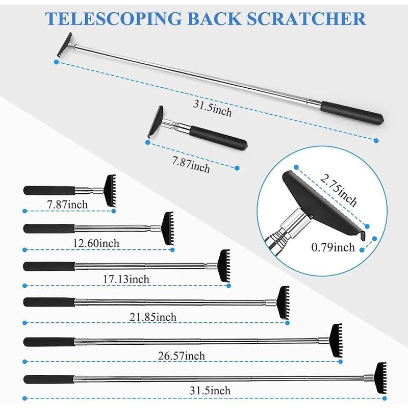 OVERSIZED BACK SCRATCHER - Stainless steel back scratcher with telescoping handle, 8.07 inch retracted, and 31.5 inches when fully extended. The widen claw is not too sharp and eliminate your itch greatly, easily scratch those hard to reach spots, and relieve stress.