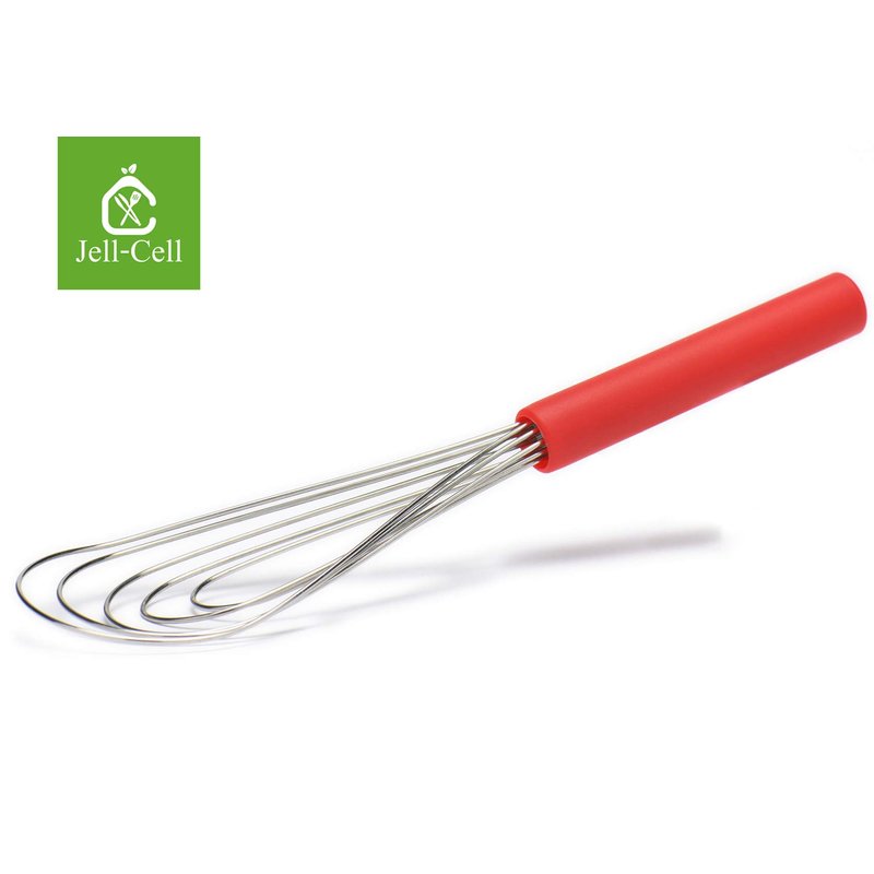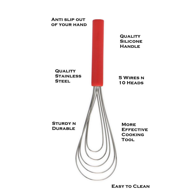 Flat Whisk Silicone Handle Non Slip 10" - 5 Wires Whisk with 10 Heads for Kitchen Cooking Color Red by Jell-Cell