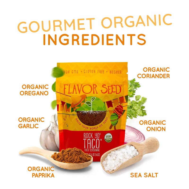 - 12 Simple Ingredients You Can Trust: Rock Yo' Taco includes only the good stuff with no MSG, fillers, binders, anti-caking agents, or preservatives. It's just Sea Salt, Organic Onion, Organic Paprika, Organic Garlic, Organic New Mexico Chile, Organic Cumin, Organic Ancho, Organic Cocoa Powder, Organic Oregano, Organic Coriander, Organic Red Pepper. All Flavor Seed spices and seasonings are Certified USDA Organic, Certified Kosher, and KSA Pareve. Try one of our all purpose seasoning mixes today!