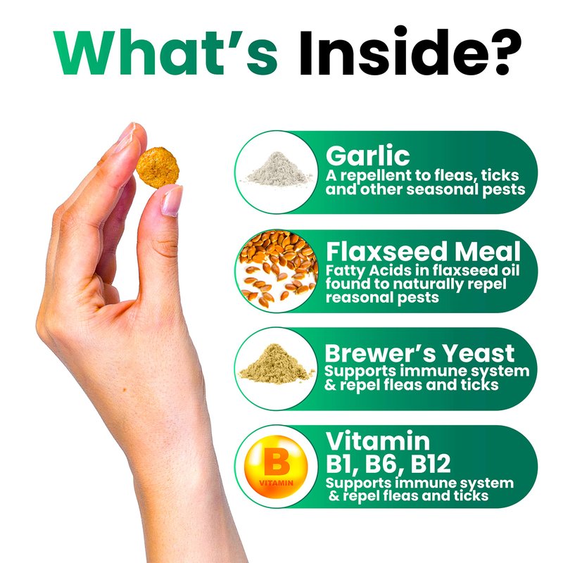 - Natural Flea & Tick Prevention - Our supplement is made with natural ingredients that helps to prevent fleas and ticks from biting your dog. It's an easy way to keep your pet free from pests
