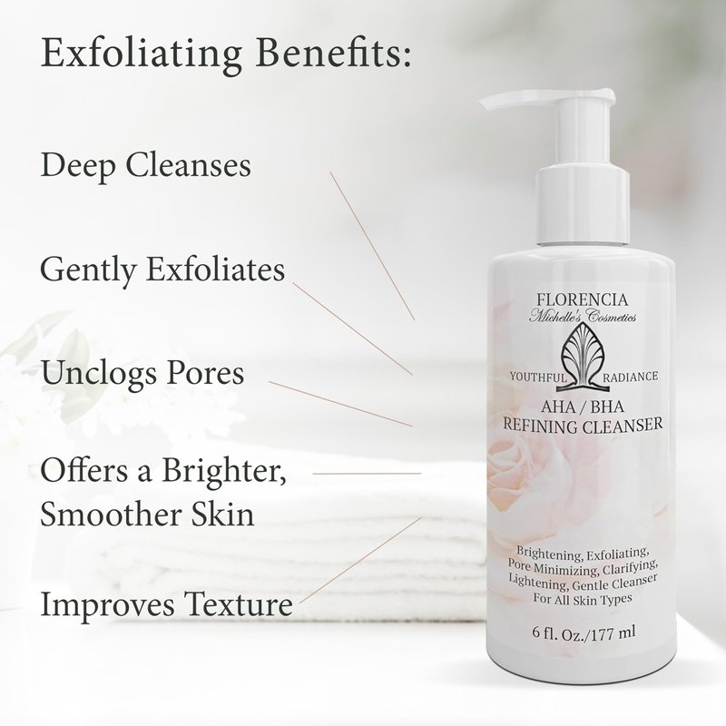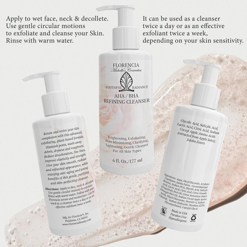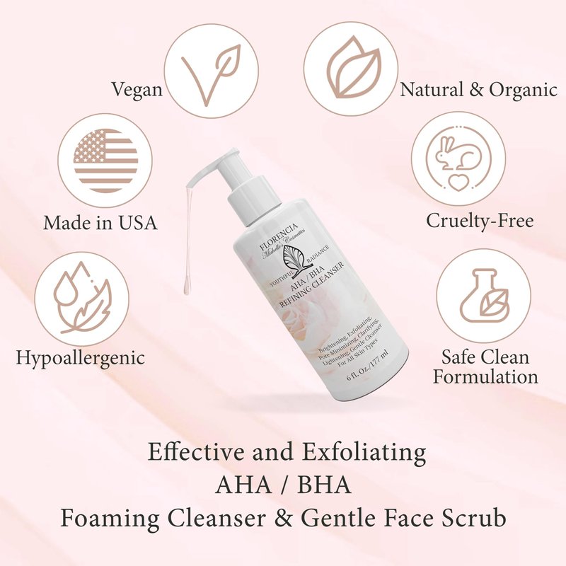 Florencia AHA BHA cleanser deep cleanses, revitalizes, rejuvenates, and revives healthy radiance by gently exfoliating and revealing younger-looking skin. Packed with natural ingredients, our natural face wash refines, refreshes and renews the skin for a youthful radiant glow. Jojoba beads, Glycolic Acid, Lactic Acid, and Salicylic Acid remove dead cells and other impurities, unclog the pores, diminish fine lines and illuminate your skin, helping to reduce acne marks and discoloration. Our exfoliating face wash encourages cell turnover and stimulates skin renewal, helps to promote elasticity and function of the skin as a strong, healthy barrier.