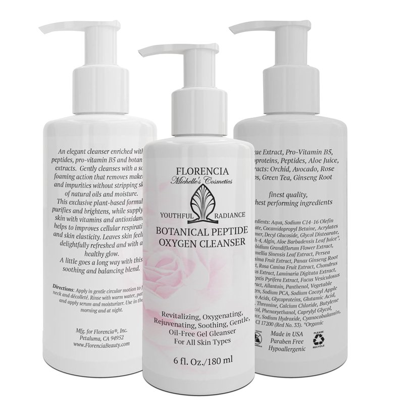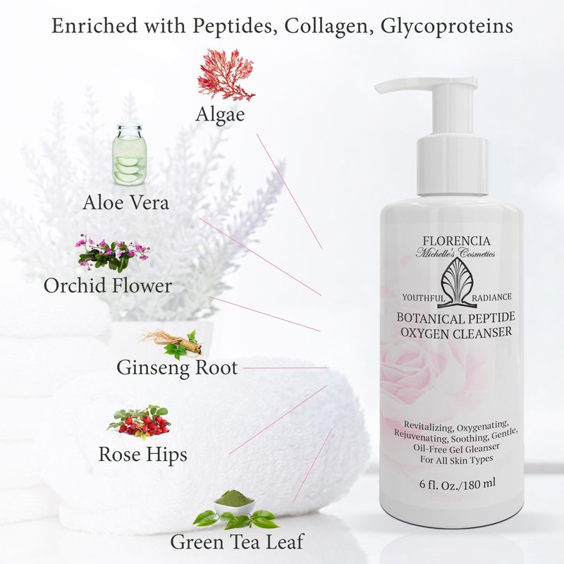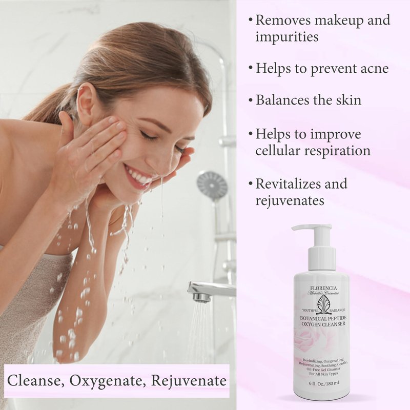 Florencia Botanical Peptide Oxygen Cleanser. Daily Foaming, Oil-Free Gel Face Wash for Dry to Oily, Sensitive Skin. Oxygen Revitalizing Cleanser w/Peptides, Botanicals, Glycoproteins, 6 Oz