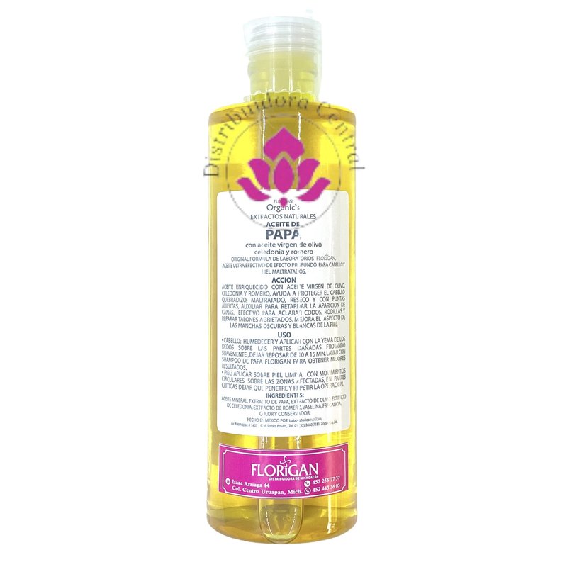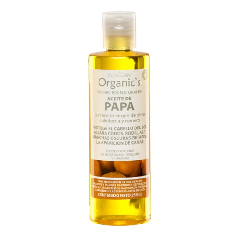 Multi Use Hair and Body Oil Aceite de Papa 250ml. Florigan Natural extraction helps create this multi use hair and body oil Aceite de Papa by Florigan Laboratories an intense moisturizing multi use oil for all skin types. Helps to combats dried cracked skin, elbows, knees and ankles. Instant deep penetration for silky soft skin. Hair use on wet or dry, keeps hair shiny and brilliant. Creates voluminous, strong and healthy hair.