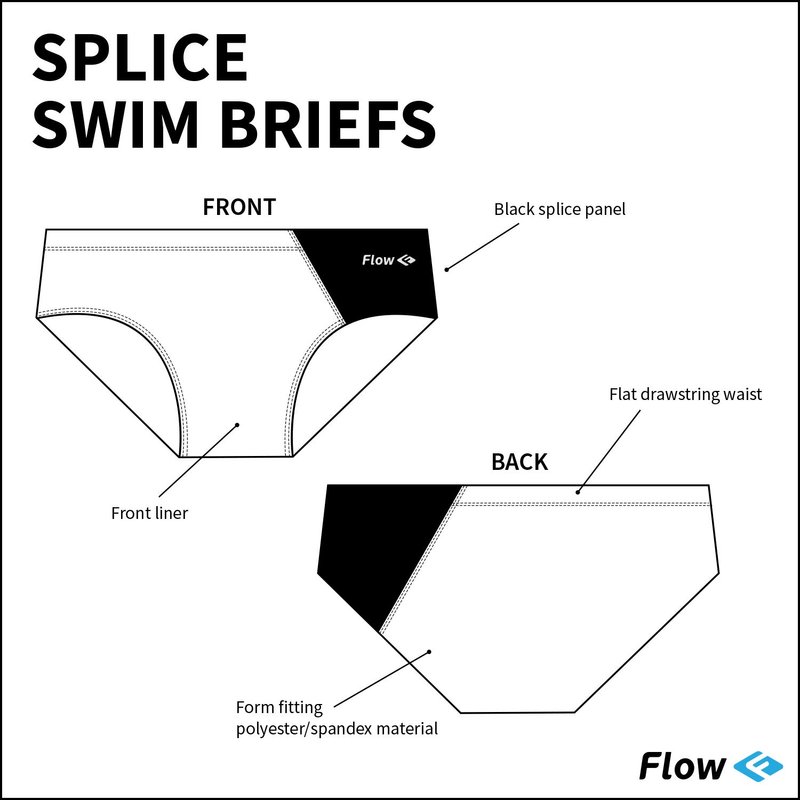 Flow Splice Swim Briefs feature a polyester spandex fabric that is the perfect combination of quality, comfort, and durability. Design details include a flat drawstring waist for a better fit, front inner lining for comfort, and sporty patterns for a stylish look. They are perfect for training at swim practice and racing at swim meets, but are also great for triathlon races, water polo, and any other water sport. Kids, teens, and young mens sizes available.