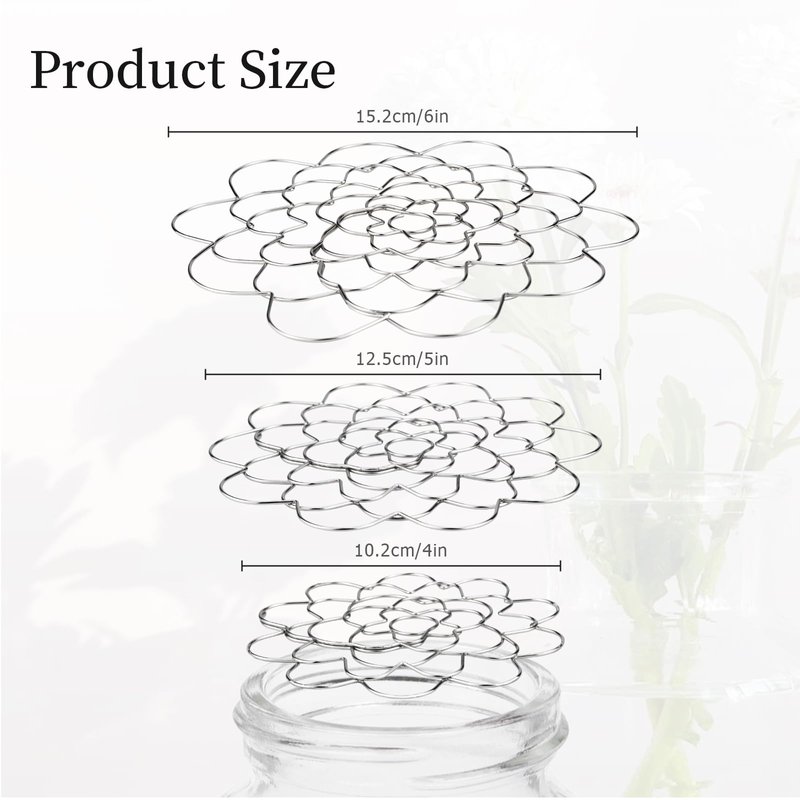 - Size Information: This metal flower arrangement lid has a diameter of 4inch/10.16cm,5inch/12.7cm,6inch/15.24cm, which is easy to use and fits most regular vases. Its compact and lightweight design ensures ease of handling and use. In addition, the lid's proper size makes it easy to store when not in use, providing you with maximum convenience and saving valuable space.