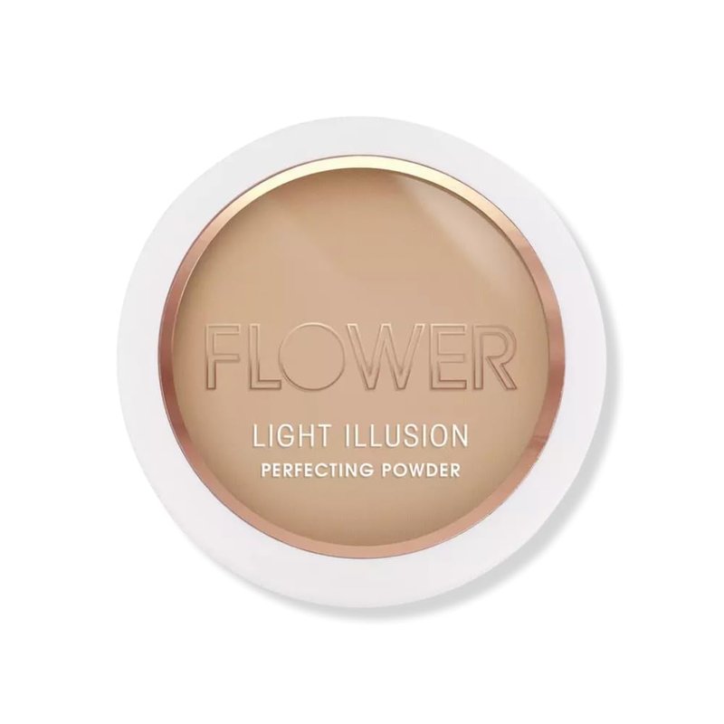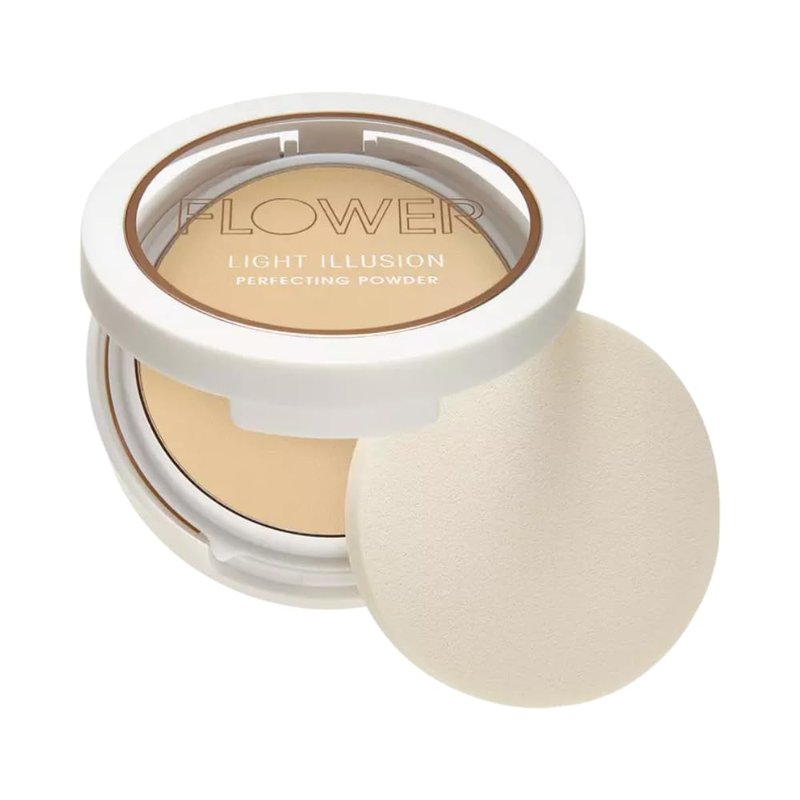 FLOWER BEAUTY Light Illusion Perfecting Powder Pressed Powder Face Makeup Buildable Medium Coverage with Blurring Pigments Includes Mirror Sponge, Tawny, 0.28 Ounce