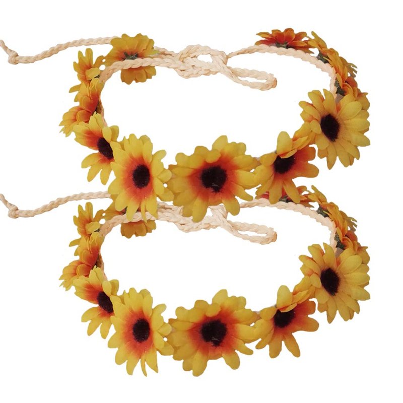 - 【PRETTY SUNFLOWER HAIR BANDS】 This bohemian sunflower crown headband set are adorable and attractive, you will love it so much. It is in shape of sunflower, cute and pretty, sexy and nifty, naughty yet innocent, multiple temptation together wearing this hair bands. It can go with everything in your closet, from your day-to-day office attire, to your evening wear, from your casual workout clothes, to jeans and a T-shirt! Like coat, dress, sweater, skirt, vest, cardigan, scarf, bikini and so on