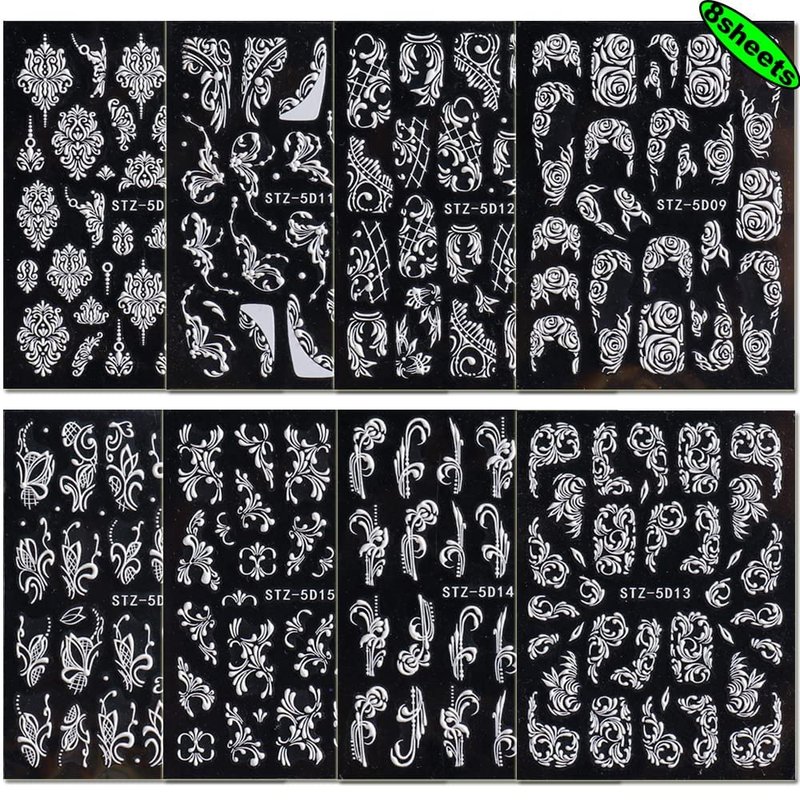 Macute 8 Sheets 5D Nail Stickers Stereoscopic Embossed Flowers Laces Nail Art Stickers Set