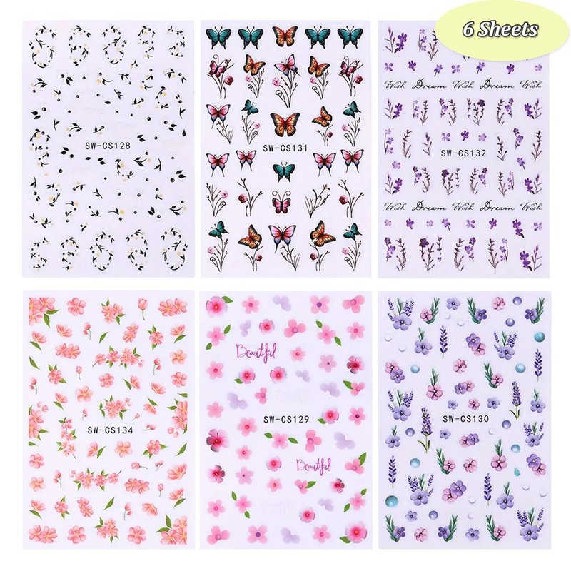 6 Sheets 3D Butterfly Lavender Flowers Design Nail Decals Floral Nail Stickers and Decals for Nail Art Decorations