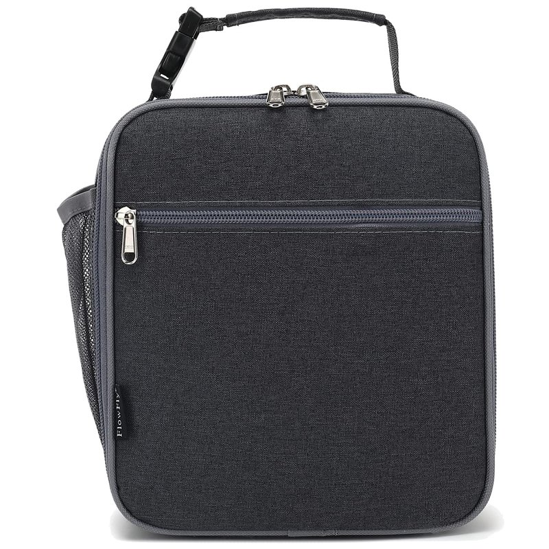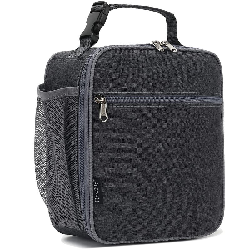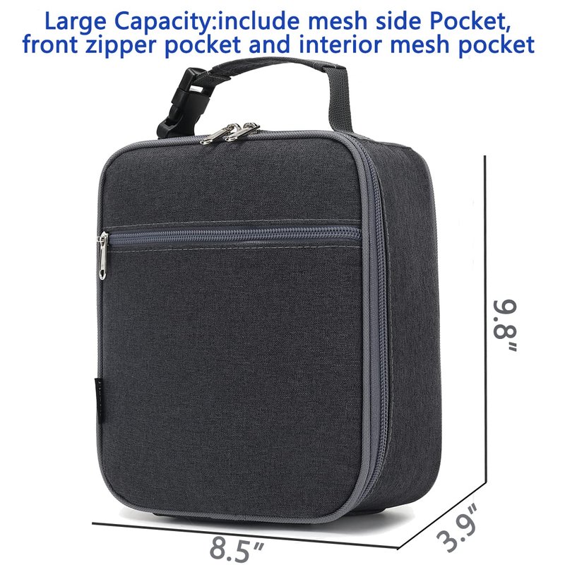 Product Features: Color: Dark Size: W:3.9 x L:8.5 x H:9.8 inches, Rectangle Material: durable 600D Polyester,food safe PEVA lining and Sturdy zippers Zippered Front Pocket and inner mesh pouch: A zippered front pocket for hiding a surprise dessert or fun note,a handy inner mesh pouch perfect for napkins and utensils,you could secure water bottles or ice pack inside the lunch pail. Soft handle: heavy duty handle for hand carry Premium fabric construction: make this compact,lightweight lunch bag durable and easy to clean.Insulation helps retain hot and cold temperature whole day to improve food quality, freshness and taste.Also it can keep the meal healthy. Product Description: The FlowFly reusable lunch bag has helped millions of families take safe, healthy meals everywhere. The roomy,spacious,insulated interior and premium fabric construction will make sure you have a nice meal, this portable lunch pail could be used for children,adult, men, women for light meal and drink,it suit for work, school, beach, travel, picnic, hiking.The adorable lunch kit is moisture resistant,quick and simple organization,perfect for Age 3+ and on the go parents.