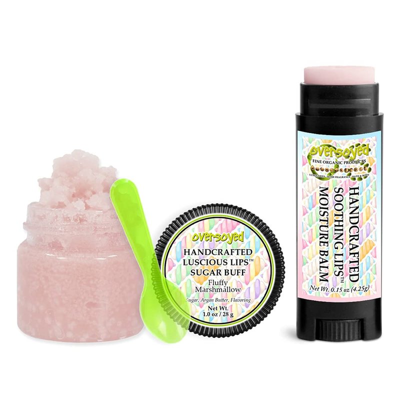 Fluffy Marshmallow Soothing & Luscious Lips by OverSoyed Exfoliator & Chapped Lip Repair Lip Care Combo | Artisan Handcrafted to Order Fluffy Marshmallow Creamy Caramel Sweet Flavored Exfoliating Sugar Lip Scrub & Lip Moisturizer Balm Gift Set